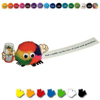 Logobug with card hands holding a tyre Ribbon attachment printed with your promotional message in full colour Large range of 44 pom pom colours and 7 different feet colours to choose from