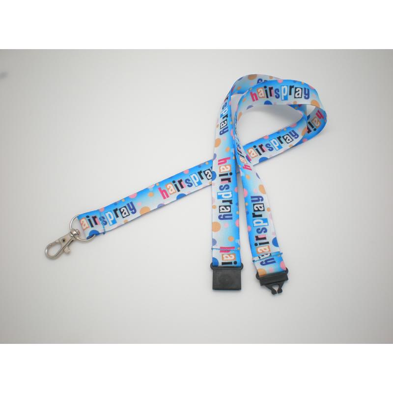 Heat transfer printed lanyards with metal alloy hook and safety break.