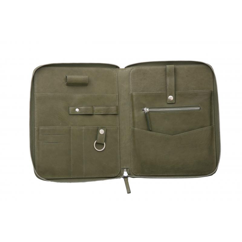 Full hide, natural grain leather. Multiple interior pockets and a zip around closure.