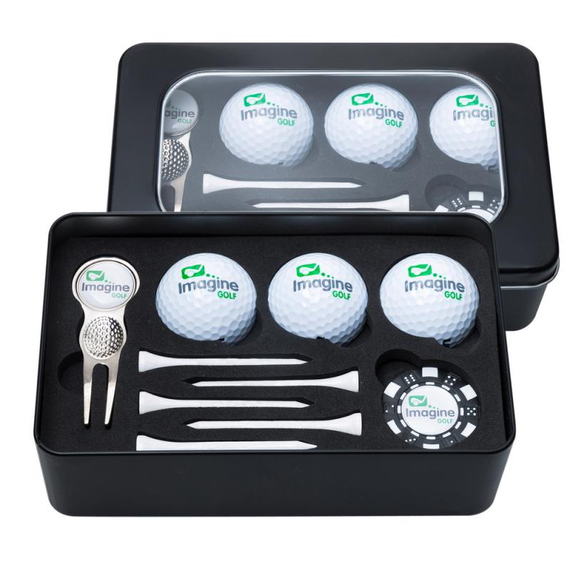 Large stylish black window tin accommodating three budget golf balls, a Quad fork with a removable ball marker and a Monaco poker chip marker printed full colour to your design with five plain white 70mm golf tees.