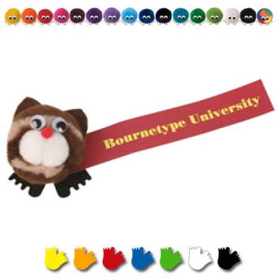 Cat logobug with ribbon attached which can be printed in full colour Large range of 44 pom pom colours and 7 different feet colours to choose from