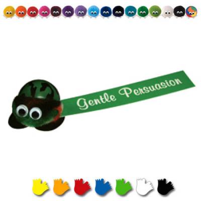 Logobug wearing an army helmet Ribbon printed with your promotional message in full colour Full range of 44 pom colours